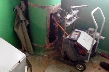 3 этап: промывка ствола водой снизу из подвала. Под давлением подается вода. Благодаря сильному напору верхний слой загрязнений смывается. Давление воды при промывке 170-180 бар. В зависимости от загрязнений ствола мусоропровода проводится разное количество циклов промывки. В некоторых компаниях вместо щетки используется специальная насадка, называемая Люстрой. Она действует, как наждачная бумага, вращаясь под напором воды, смывая патогенные микроорганизмы и бактерии, осевшие на стволе.